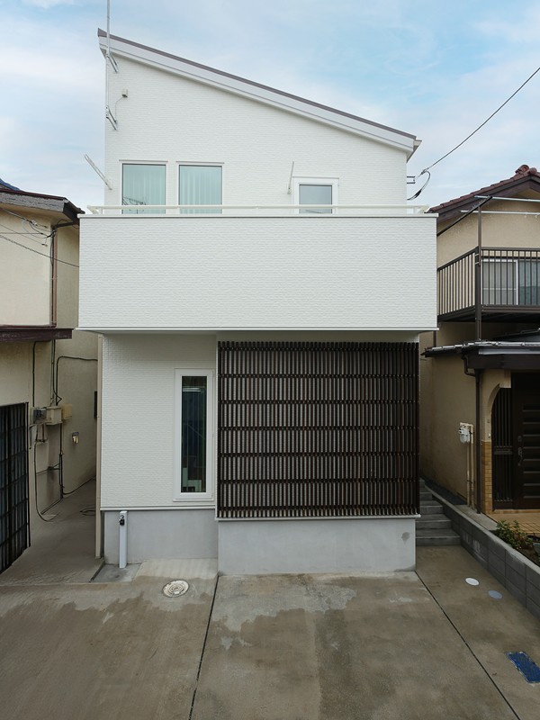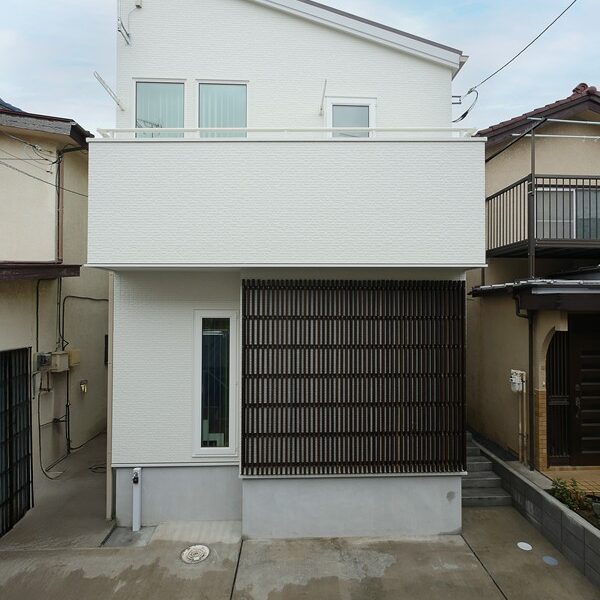 - 古い住宅街にも馴染むよう、木の縦格子を配した外観。主張しすぎないデザイン