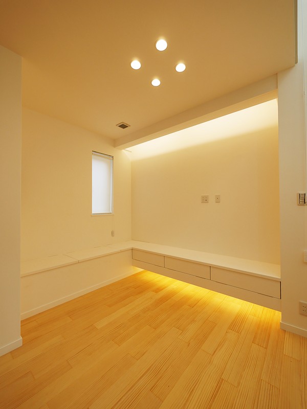 - リビングには、造作収納付ベンチクッションをおいてソファーに。オリジナル建築化照明で日常の暮らしを最高のひと時に